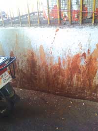 Not surprisingly, while all this beautification is going on, the average citizen of Chennai appears to care very little about it as evinced by the accompanying photograph which displays the kind of art which Chennai is famous for – spittle spray. It’s a pity that we have only one colour – red. And the work shown here is what embellishes the foot of the Gemini Flyover, a stone’s throw from where this sculpture stands.