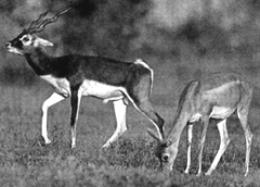 “The fully grown adult bucks had a black coat on their backs and had horns with three rings. The sub-adult males did not have so dark a coat and had horns with one or two rings. The females were light coloured and the white stripe across their belly was prominent. There were fawns too. The first group that we saw consisted of an adult male, a female and a fawn. They appear to have sensed our approach though we were at quite some distance. Through the binoculars we saw the majestic splendour of the male, standing erect and tense, poised to run if we approached closer. The female and the fawn were grazing quitely nearby.”